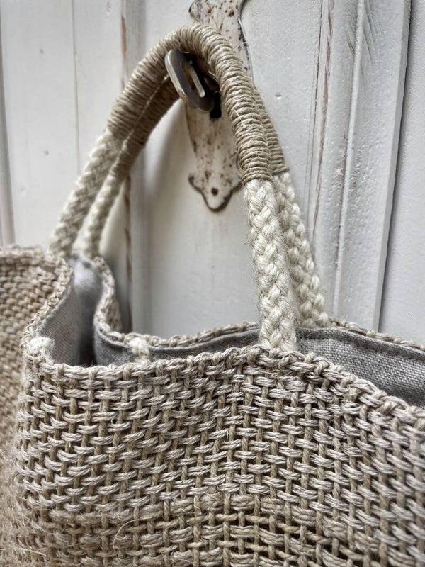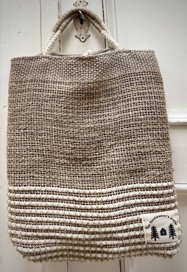 A rustic, handwoven bag made from natural linen and flax, combined with Yorkshire fleece wool. Lined with pure linen and finished with durable handles crafted from wool and flax.